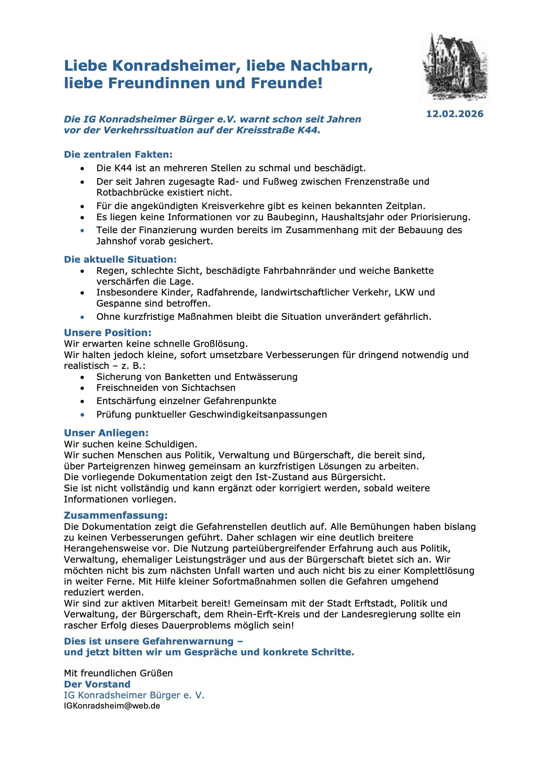 Die IG Konradsheimer Bürger warnt seit Jahren vor der Verkehrssituation auf der Kreisstraße K44.