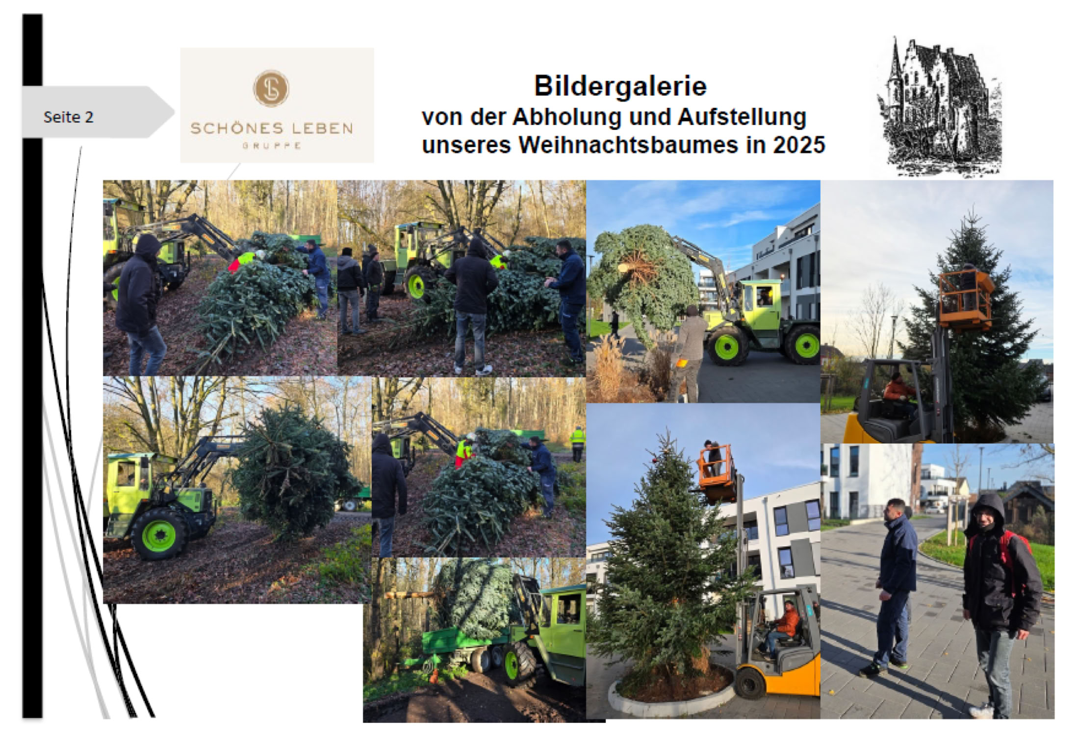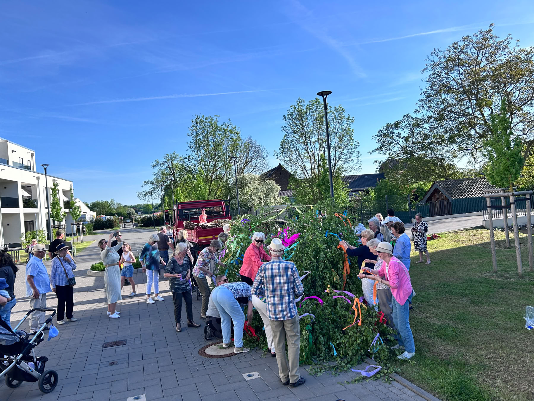Unter reger Beteiligung der Anwohner in der Residenz „Schönes Leben“ wird am 30. April 2025 ein rund 12 Meter hoher Maibaum auf dem neuen Dorfplatz im Bereich der Residenz errichtet, nachdem die Anwohner ihn liebevoll geschmückt hatten.