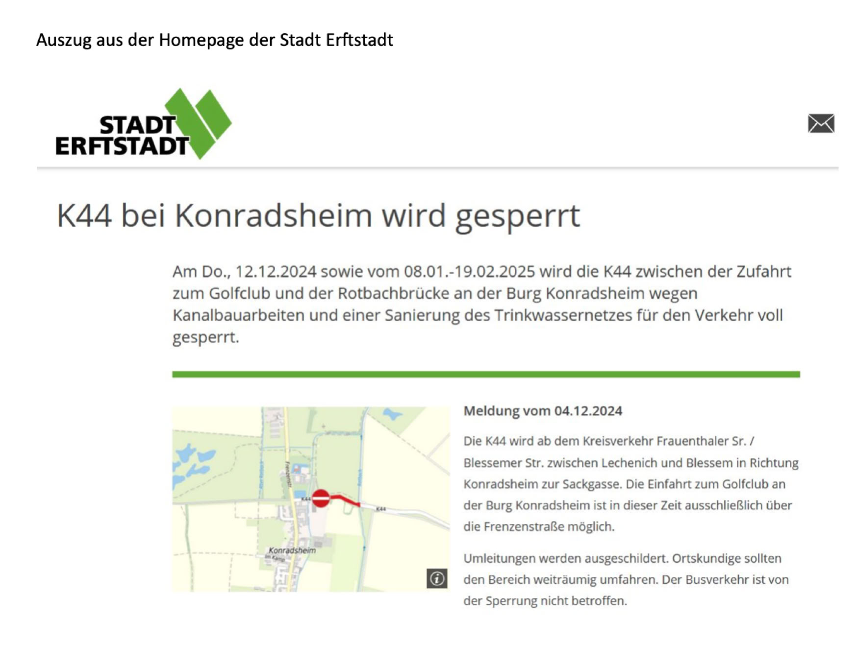In den letzten Tagen war Konradsheim mehrfach in den Medien zu finden. Es gab zahlreiche Fragen zu dem zweiten noch fehlenden Abwasseranschluss und wie es mit den beiden geplanten Kreiseln und mit der riesigen Hotel Baugrube in Konradsheim weitergehen soll. Diese Fragen beschäftigen viel mehr Menschen, als wir gedacht haben. Als Anwohner freuen wir uns natürlich für jede Unterstützung. Eines ist wohl inzwischen überall klar geworden: so wie es jetzt ist, kann und darf es nicht weitergehen. In den letzten Tagen haben sich mehrere Ausschüsse in Erftstadt mit dem Thema befasst. Zuletzt hat es zudem drastische Bild und Text Beiträge zu den Themen gegeben. Jetzt scheint ein ganz kleines Licht am Ende des dunklen Tunnels. Leider schwingt sofort die Suche nach Schuldigen mit. Wie immer, will es keiner gewesen sein. Besonders einfach ist es alles auf Jemanden zu schieben, der nicht in der Nähe ist, der sich nicht wehren kann. All das kennen wir aus vielen Lebenslagen. Selbstverständlich gibt es dazu umfangreiches Material. Wir haben als IG Konradsheimer Bürger dieses Material gesammelt, teilweise wurde es uns auch zugeschickt. Es ist nicht unser Ziel uns an Schulddiskussionen zu beteiligen. Wir wollen, dass der unhaltbare Zustand nach nun mehr als einem Jahr rasch beendet wird. Dafür bitten wir um Unterstützung. Unsere zweite Bitte ist das Thema nicht zum Gegenstand parteipolitischer Diskussionen werden zu lassen. Das hilft nämlich nicht, kostet nur Zeit und schürt Hass und Ärger. Wir als Interessengemeinschaft müssen uns sowieso parteipolitisch neutral verhalten. Das schließt natürlich nicht aus, dass wir Fehlverhalten feststellen und auch darüber informieren. Selbstverständlich auf Grundlage der Dokumente und ohne Mutmaßungen. Es werden schon genug Räuberpistolen in der Stadt erzählt. Soweit es unsere Zeit erlaubt, sind wir als Zuhörer bei den Sitzungen im Rathaus dabei, wenn es um Interessen von Konradsheim geht. Aber das ist nur informatorisch, denn als Zuhörer bei öffentlichen Sitzungen dürfen wir dabei sein, aber eben nur als Zuhörer. Es hat sich über die vielen Jahre mit dem Thema Jahnshof bewährt, ständig auf dem Laufenden zu bleiben und von allen beteiligten Seiten die Informationen zu holen. Das ist besonders dann nützlich, wenn von verschiedenen Seiten unterschiedliche Darstellungen verbreitet werden. Letztlich war das für uns der Grund allen Fraktionen unseres Stadtrates ein Gesprächsangebot vor Ort zu machen.
