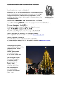 Ich habe mir unseren Flyer von Weihnachten 2023 noch einmal durchgelesen und habe dann etwas traurig festgestellt, dass ich fast alle Punkte von vor einem Jahr auch heute noch genauso wiederholen könnte. Der Vorstand wird sich dadurch nicht entmutigen lassen und sich weiterhin für die Interessen von Konradsheim einsetzen. Für unsere Behörden und die Verwaltung ist ein Jahr möglicherweise ein zu kleiner Zeitraum für das Lösen von Problemen vor Ort.
