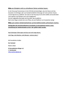 4. Auf der Sitzung wurden dazu angesprochen: die Zuwegungen, die Kreisverkehre, der Radweg, die kleine Brücke über den Rotbach, der Fuß- und Radweg K44.